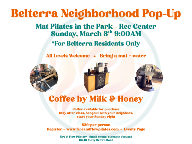 Join Fire & Flow Pilates for a Mat Pilates in the Park pop-up at the Belterra Rec Center. Expect a feel-good workout that leaves you stronger, looser, and standing taller… with a community vibe that makes it way easier to actually show up.